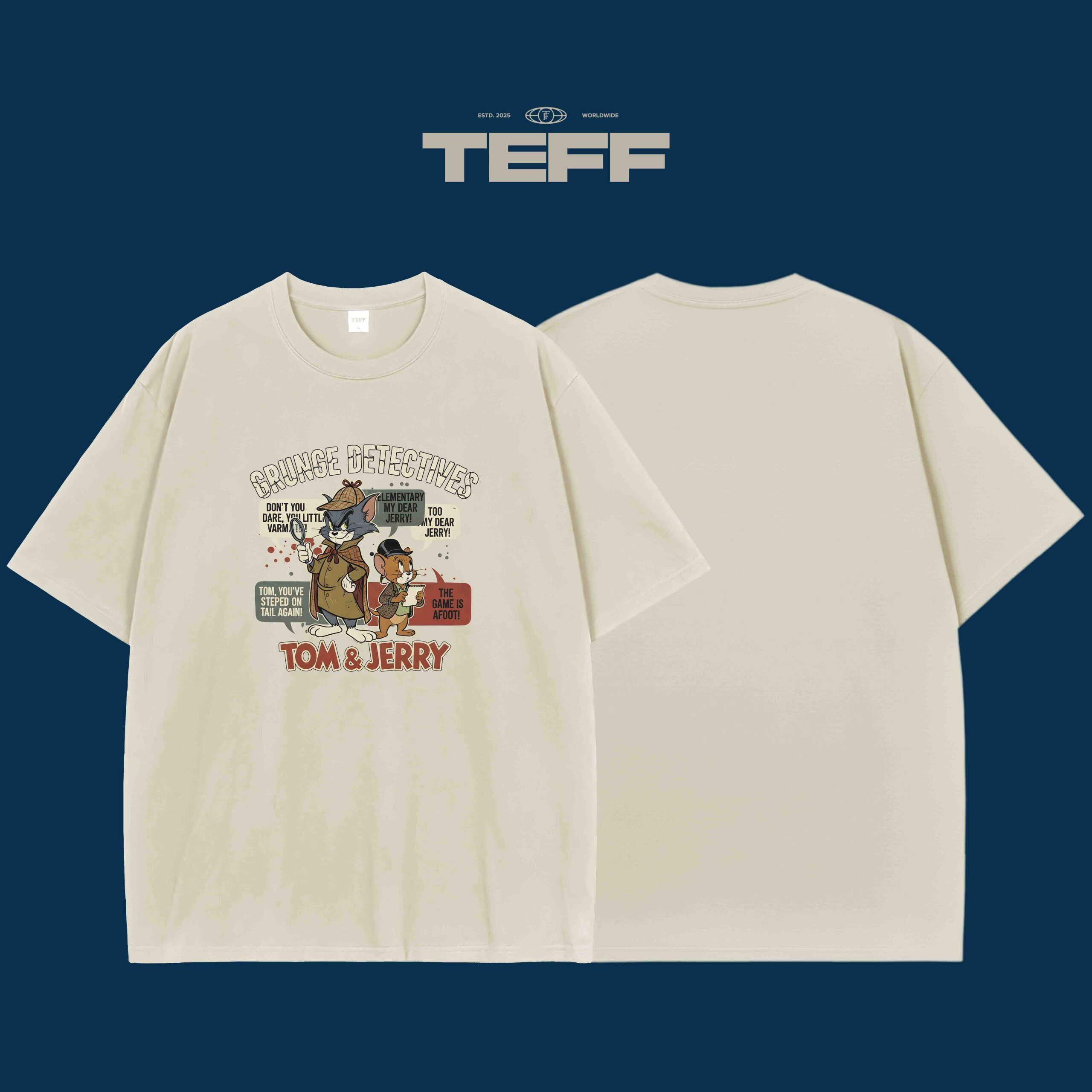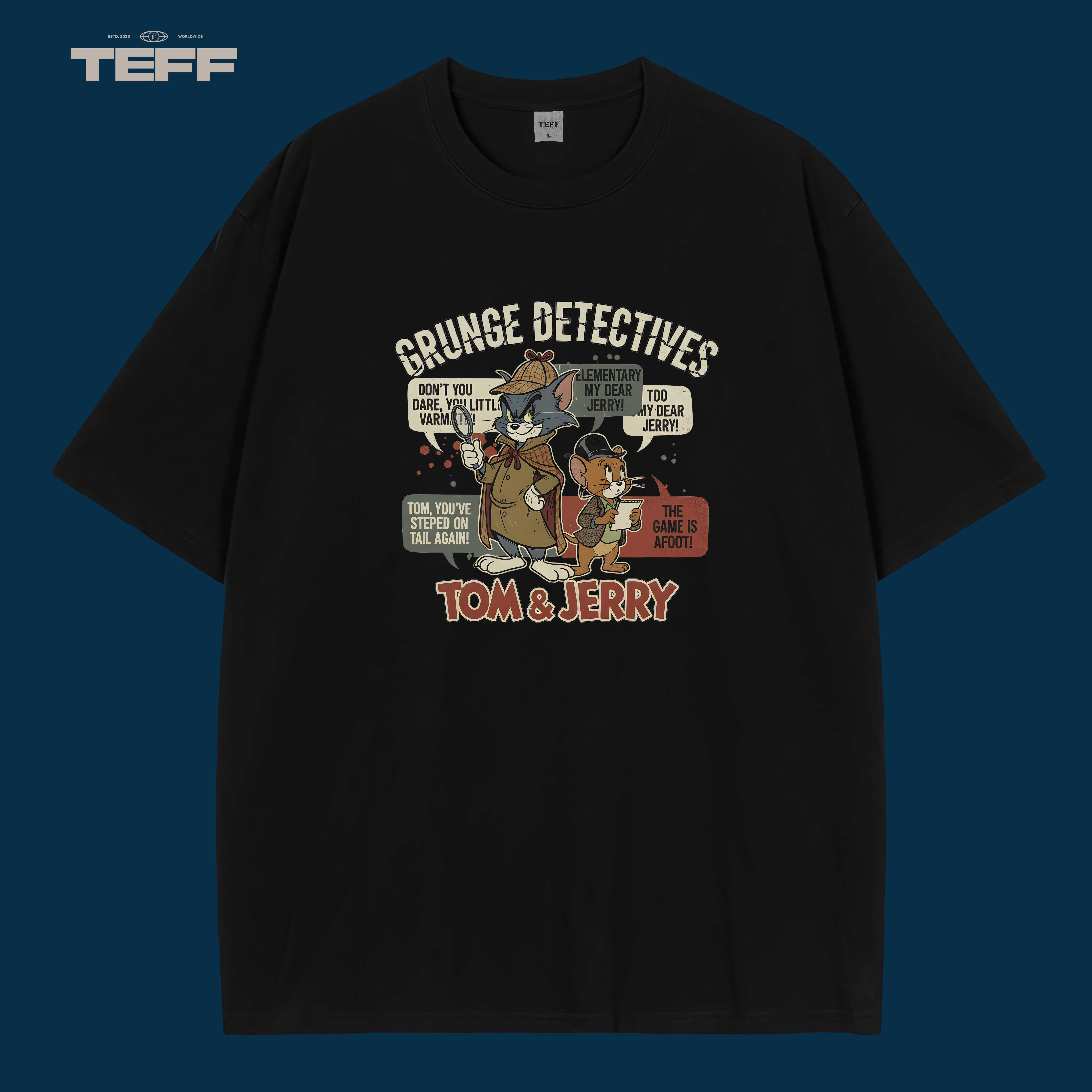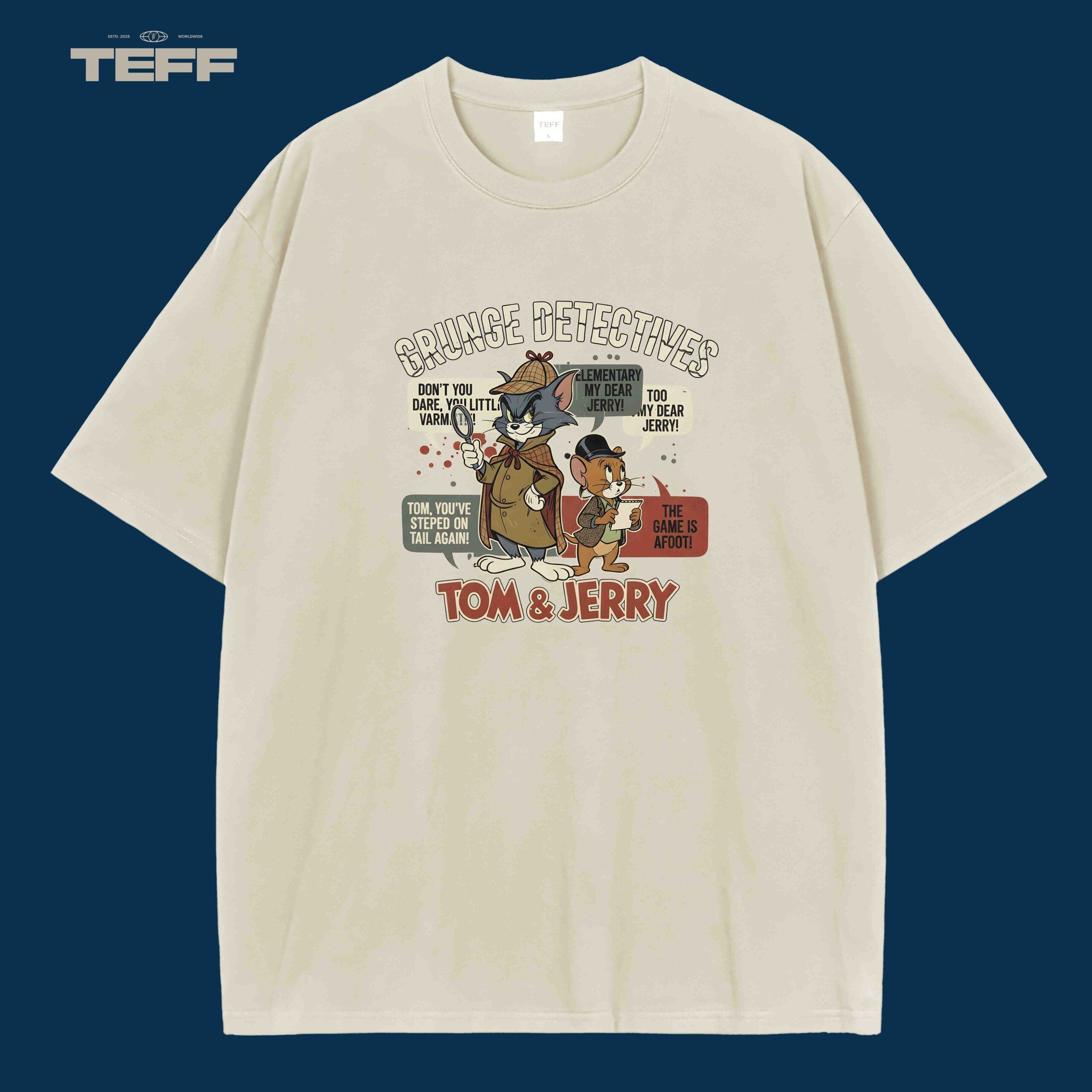 The Grunge Detectives T Shirt captures the timeless spirit of Tom and Jerry in an artistic retro style. Inspired by detective adventures, it portrays the iconic duo dressed as classic sleuths, blending humor and style in every detail. The lively color palette and expressive typography make this piece a standout for fans and fashion lovers alike.