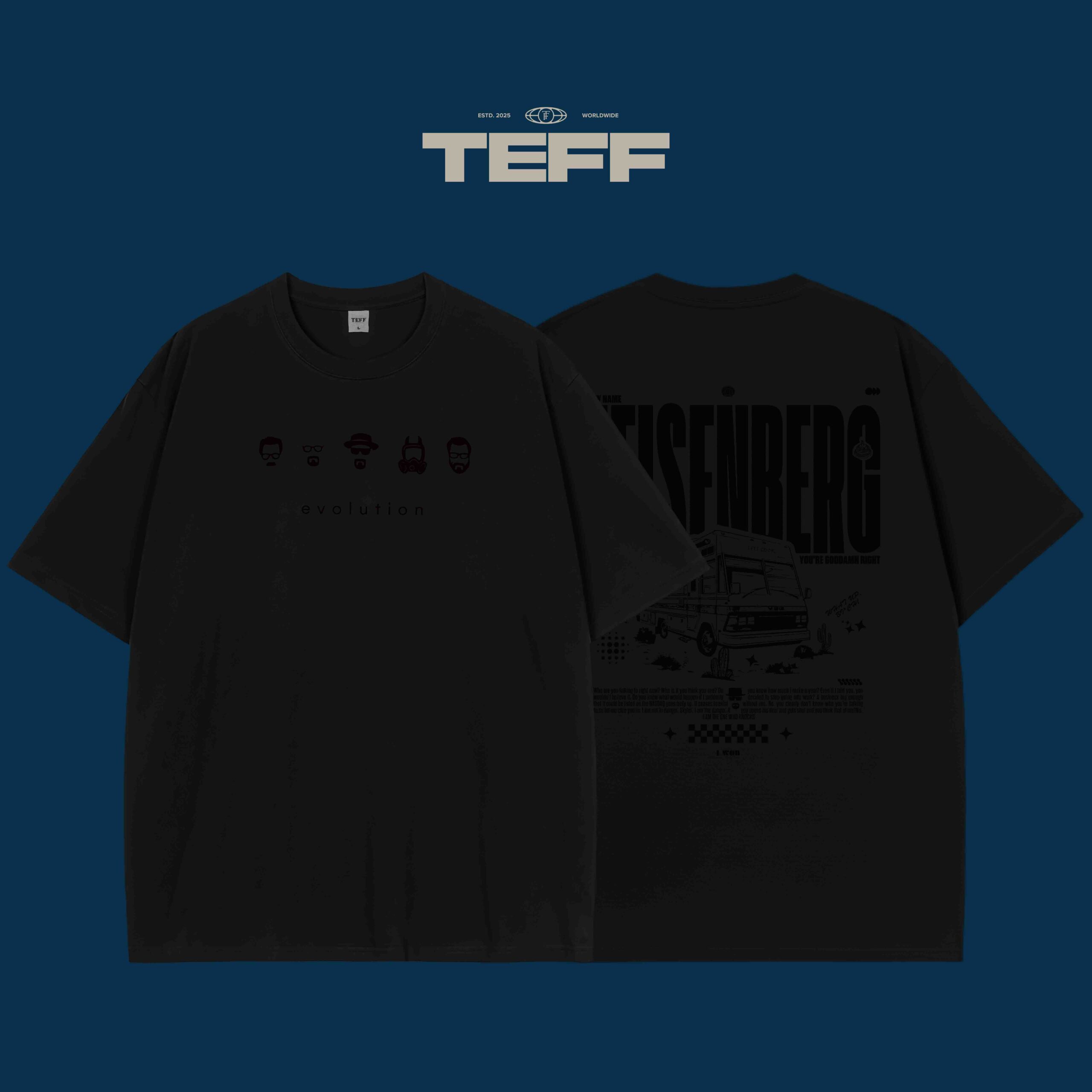 The front showcases the “Evolution” of Walter White from his humble beginnings to his Heisenberg persona, capturing his journey through minimalist character icons. The back is where the real magic happens, with a bold “HEISENBERG” graphic, inspired by the iconic moment in the series. The design is completed with a vintage-style van and catchy quotes that any fan of “Breaking Bad” will instantly recognize. A perfect nod to the transformation of a man from a chemistry teacher to a feared drug kingpin.