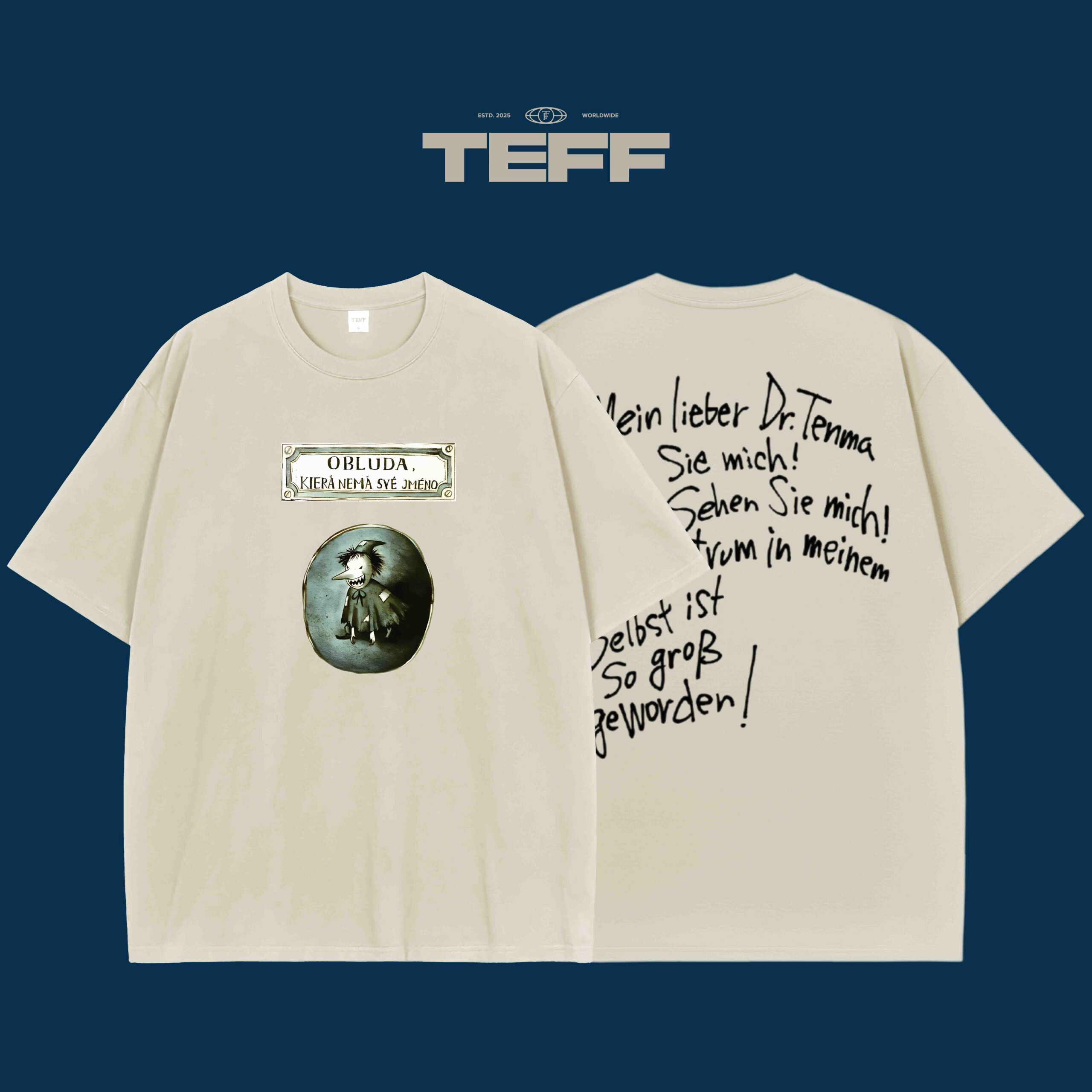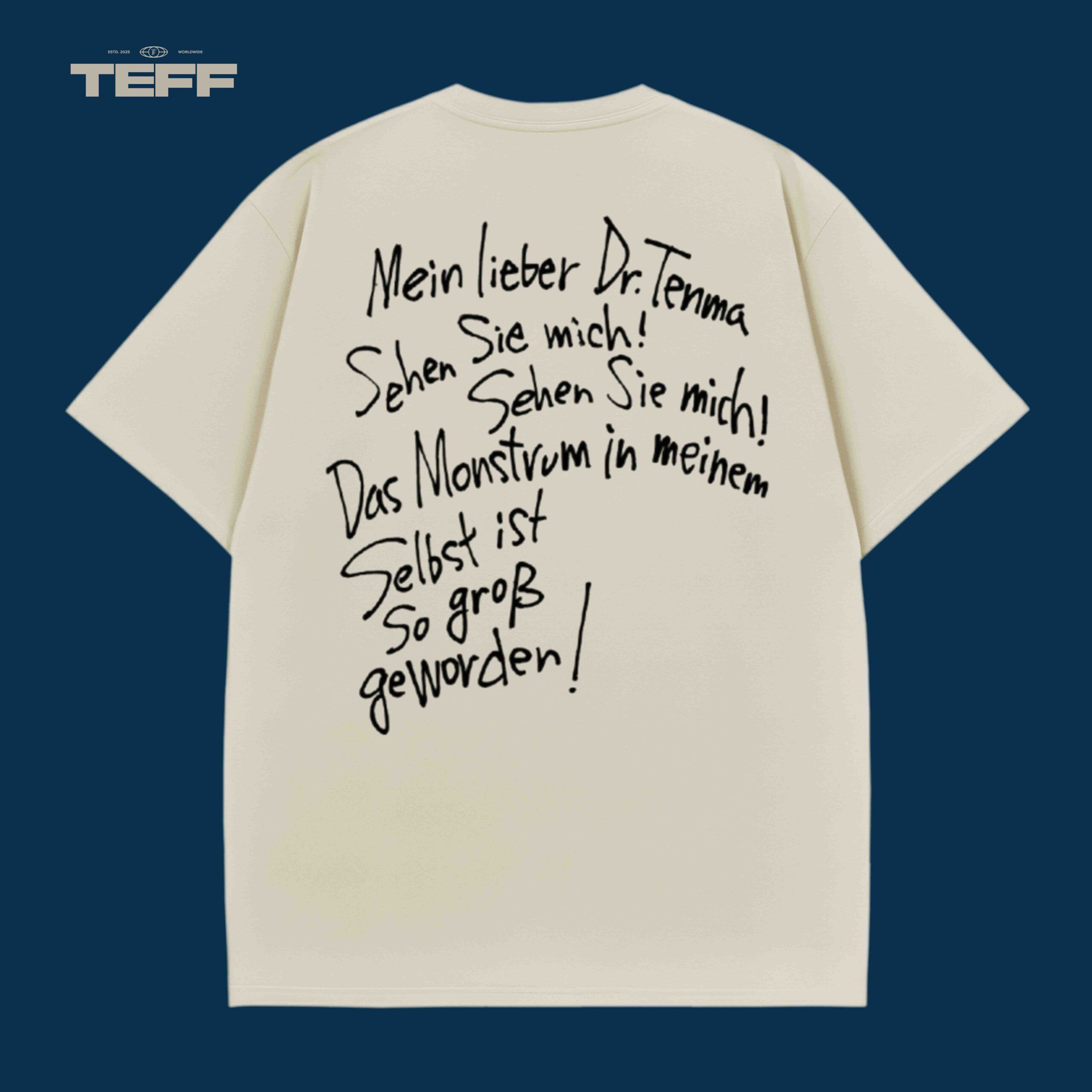 This design is deeply inspired by the dark and thought-provoking world of Monster. The front of the t-shirt showcases the eerie image of the character, with a dramatic visual evoking mystery and sadness. The back of the shirt displays a famous quote from the character, “Mein lieber Dr. Tenma, Sehen Sie mich!” (My dear Dr. Tenma, see me!), representing the psychological depth of the character’s internal struggle. The design captures the hauntingly beautiful essence of Monster, blending its psychological themes with visual storytelling.