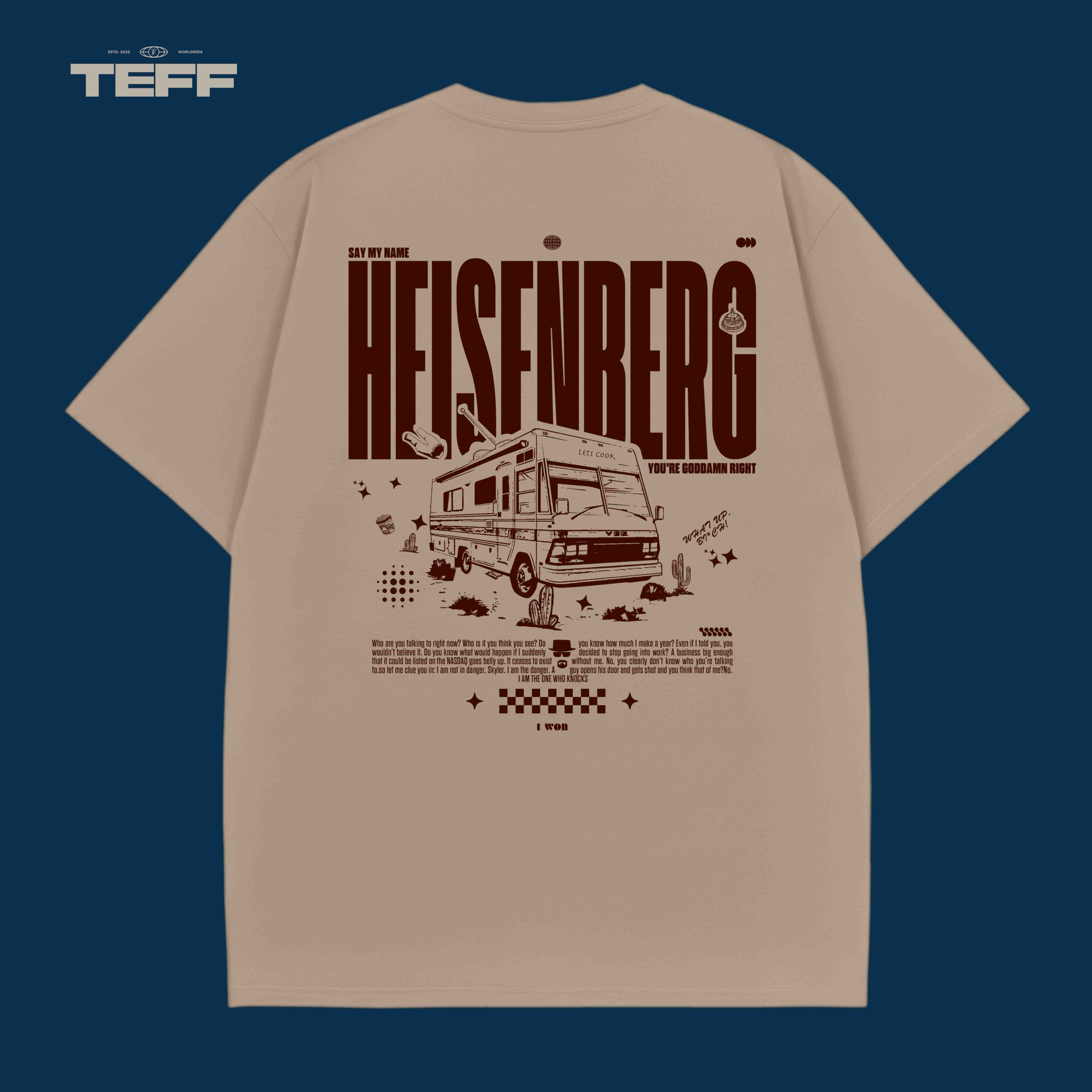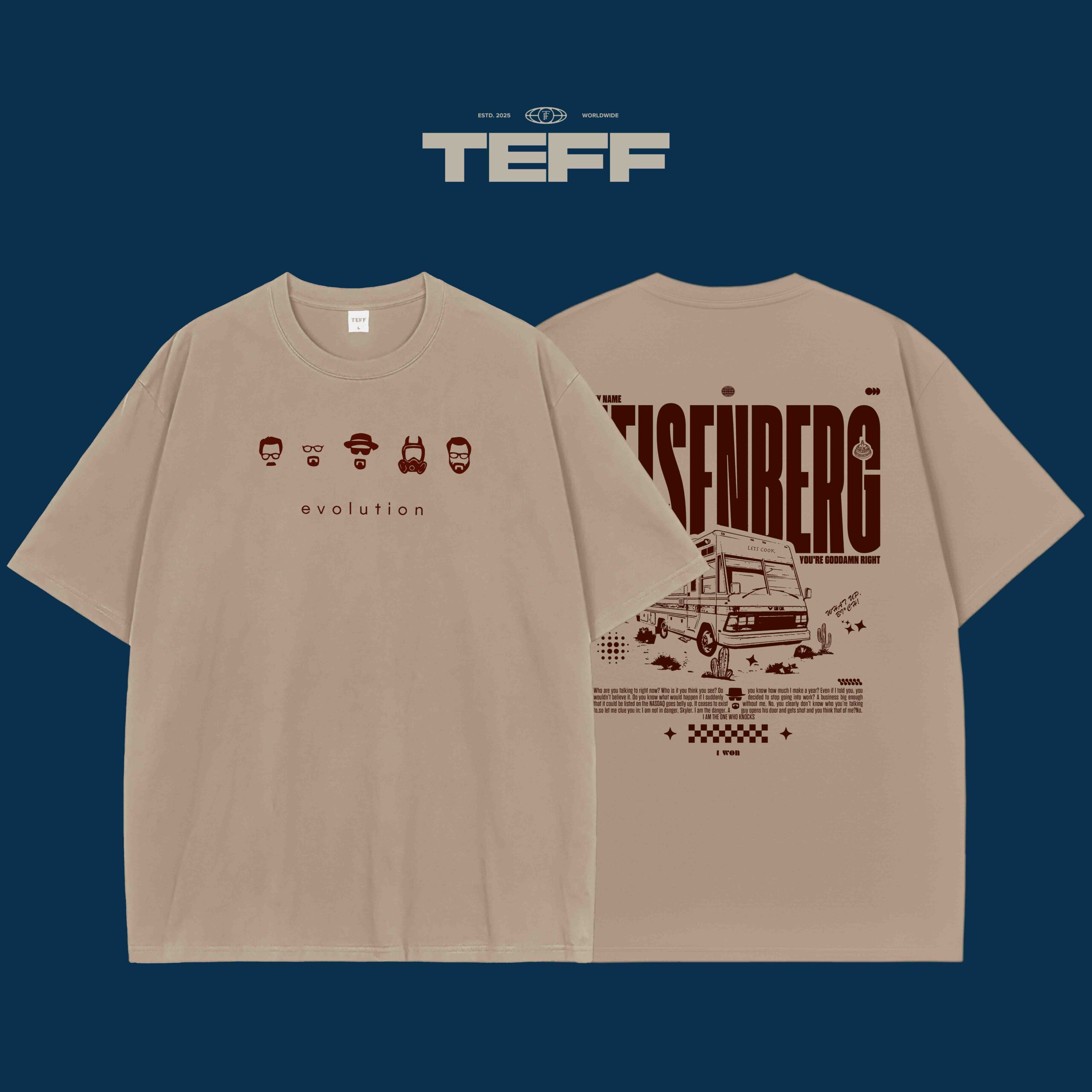 The front showcases the “Evolution” of Walter White from his humble beginnings to his Heisenberg persona, capturing his journey through minimalist character icons. The back is where the real magic happens, with a bold “HEISENBERG” graphic, inspired by the iconic moment in the series. The design is completed with a vintage-style van and catchy quotes that any fan of “Breaking Bad” will instantly recognize. A perfect nod to the transformation of a man from a chemistry teacher to a feared drug kingpin.