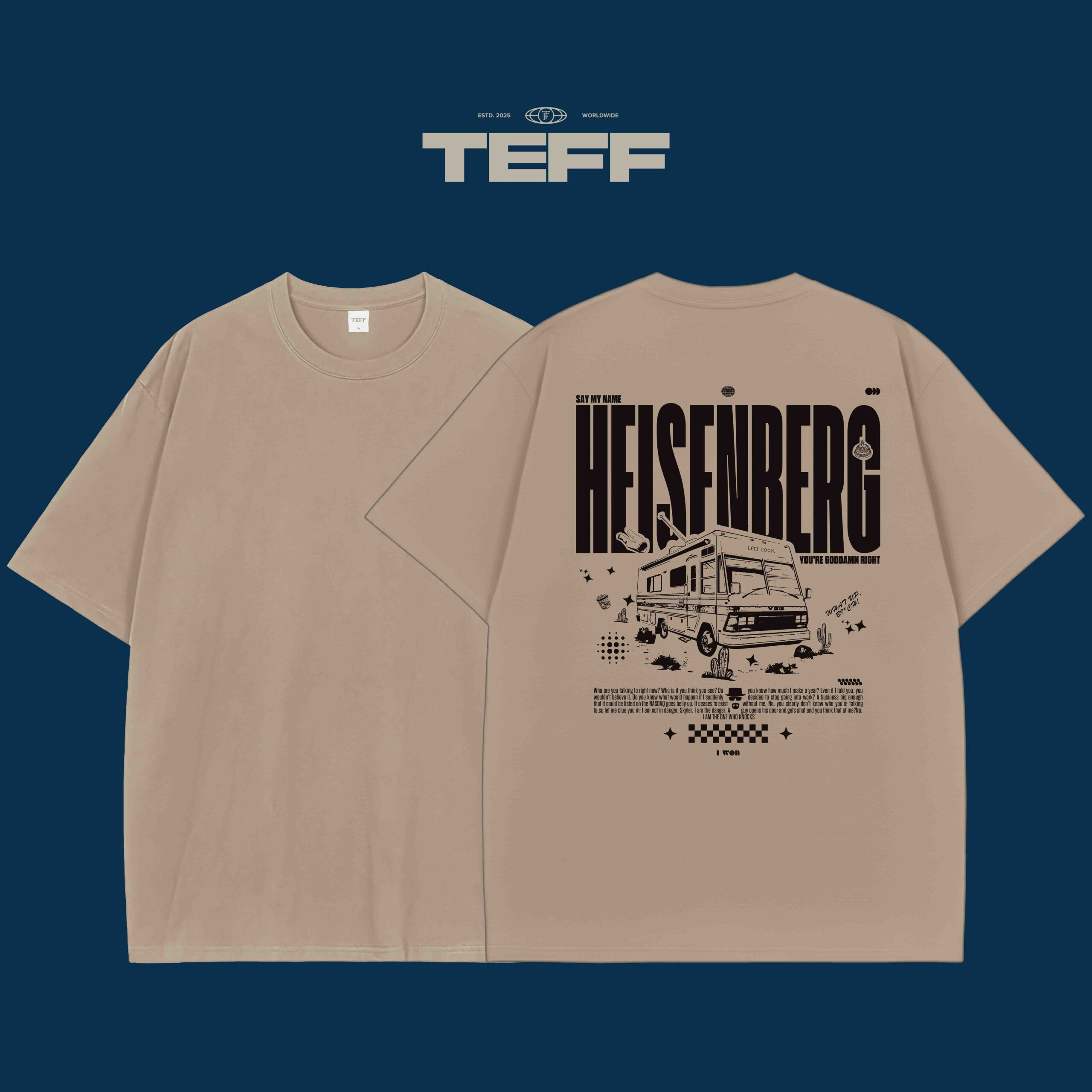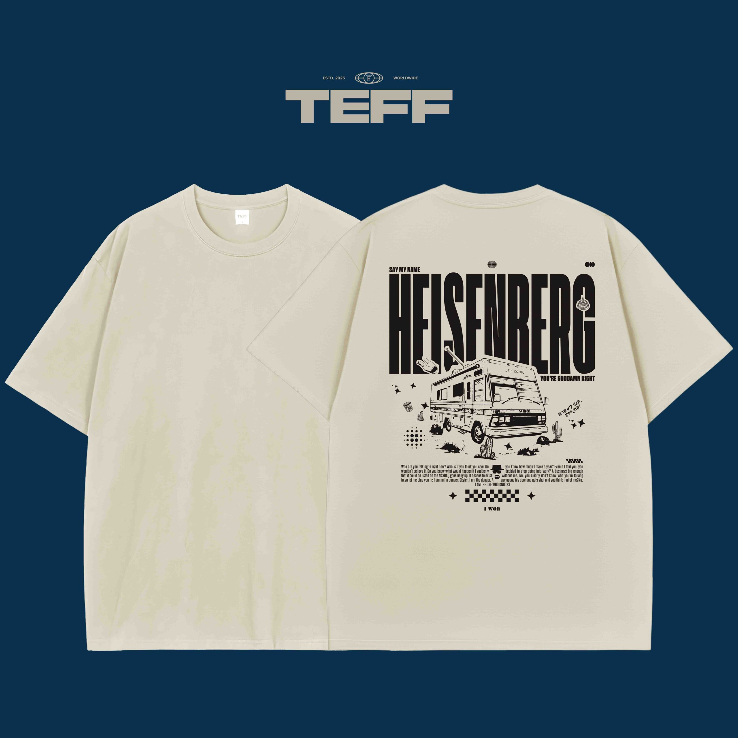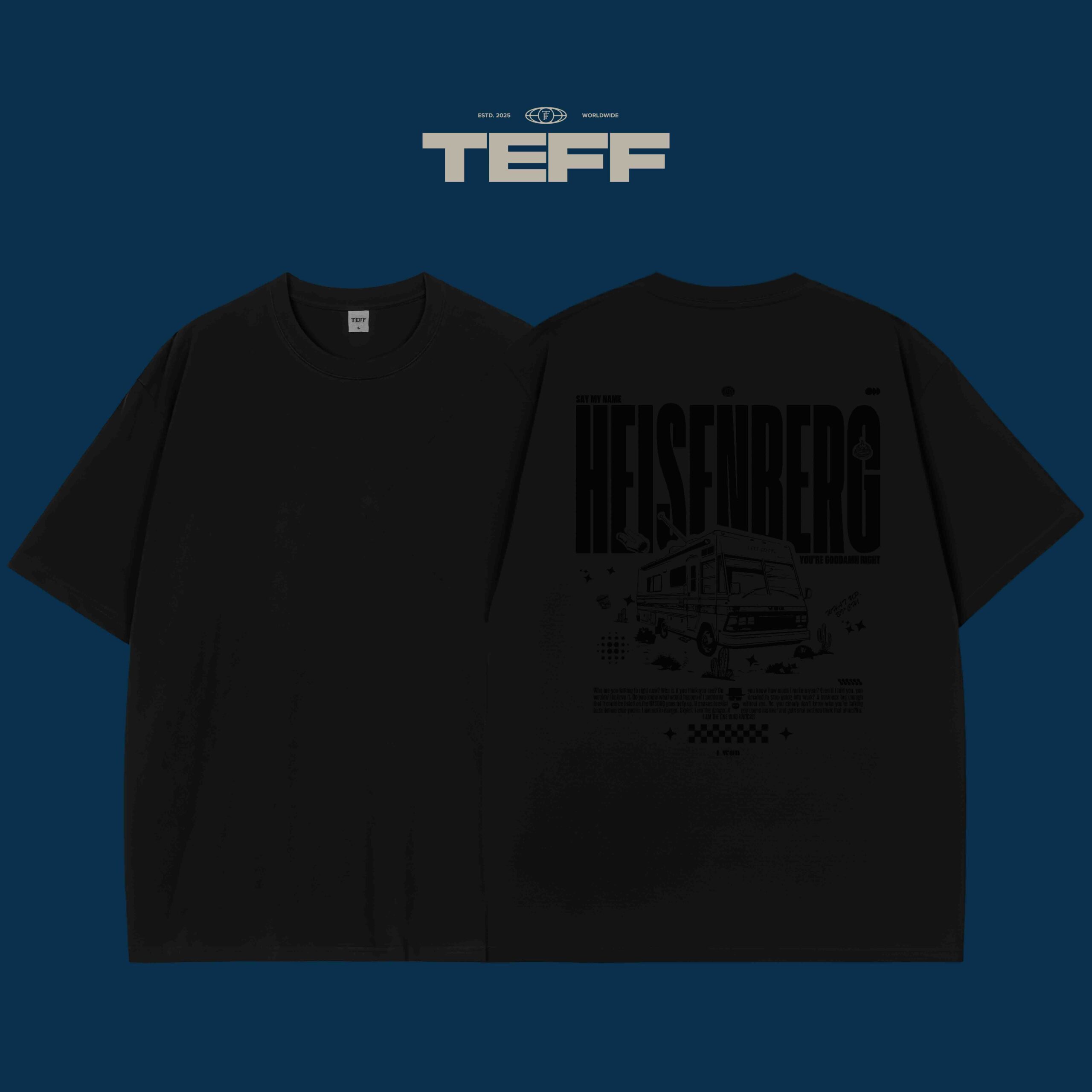 The Heisenberg T-shirt offers a stunning back graphic inspired by the iconic moment in pop culture. The shirt features the infamous “Say my name” quote alongside an illustration of Heisenberg’s signature RV. It captures the essence of rebellion and self-assertion, with “YOU’RE GODDAMN RIGHT” boldly written beneath. The design also includes small details such as a chemical flask, desert motifs, and a slightly faded aesthetic to mimic the gritty, raw feel of the series. The DTF print ensures that the image remains sharp and vibrant, making this T-shirt not just a piece of clothing but a declaration of identity.