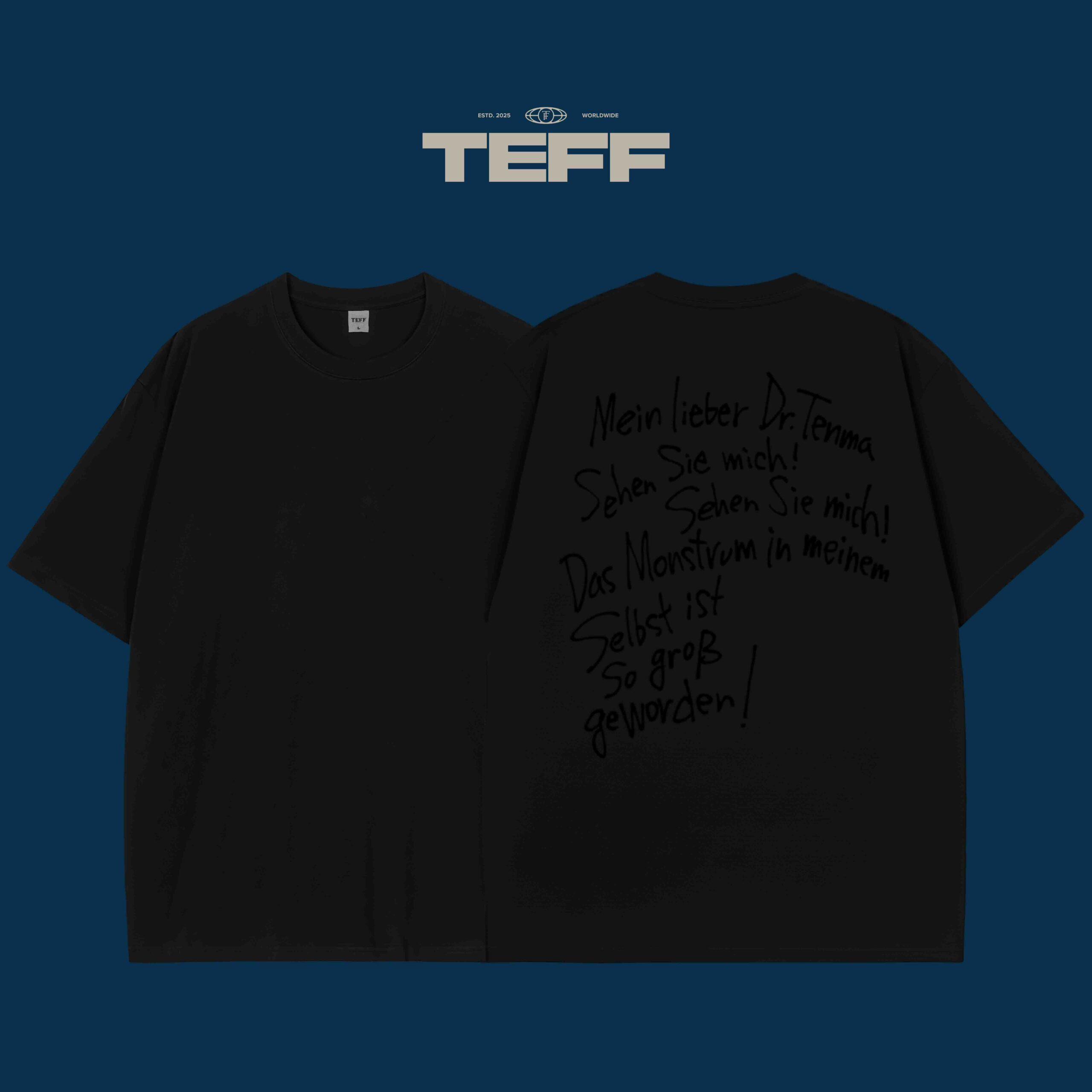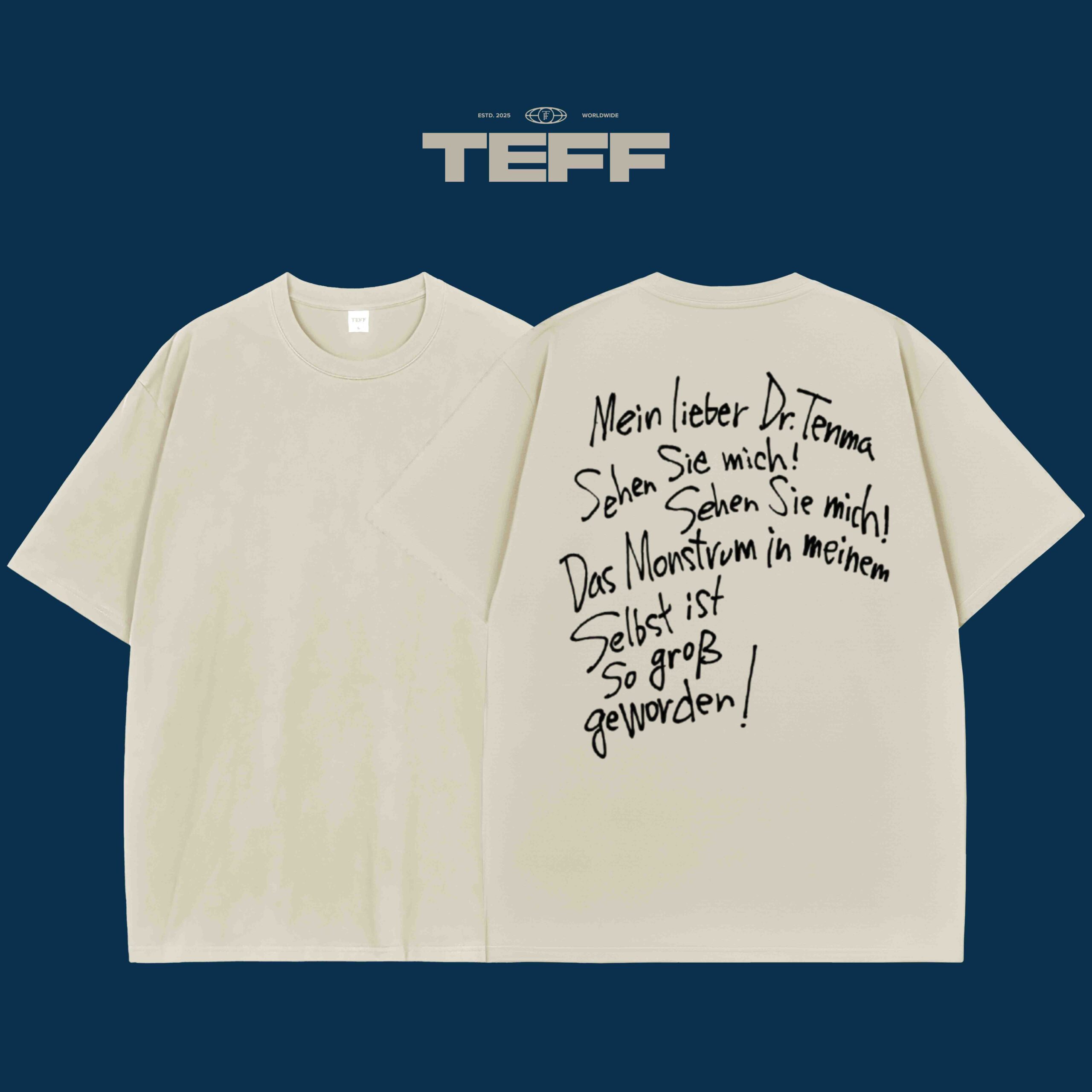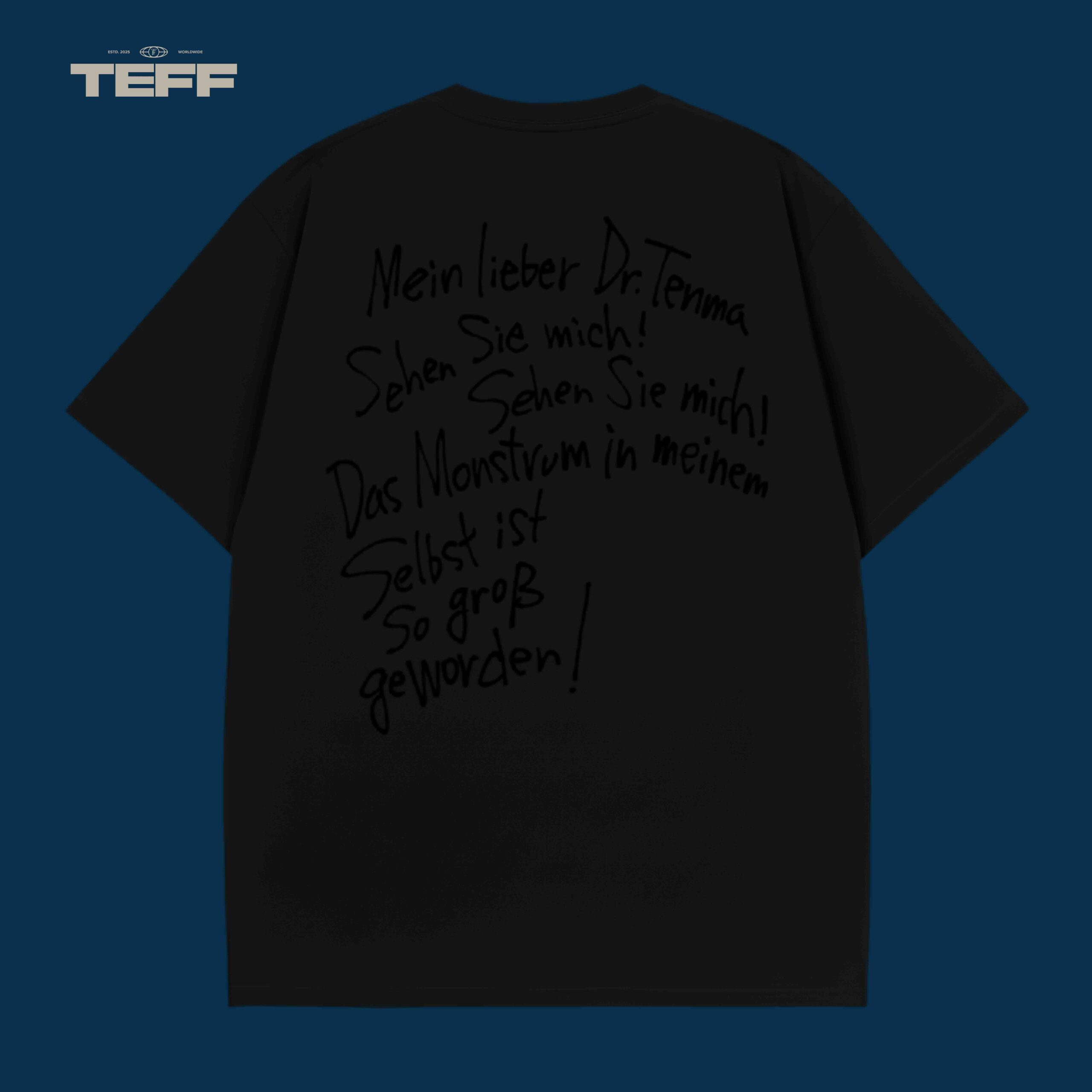 The “Mein lieber Dr. Tenma” T-shirt embraces a deeply emotional and dramatic design that pulls from the core of a well-loved character’s journey. On the back, the handwritten words “Sehen Sie mich!” (See me!) capture the pain of a character grappling with inner turmoil. The design features intense, expressive handwriting that evokes the raw emotions of the character’s internal struggle, with “Das Monstrum in meinem Selbst” and “So groß geworden!” reflecting the monster they’ve become within themselves. The text is accompanied by dramatic strokes and curvy lines, adding an extra layer of emotion and power.