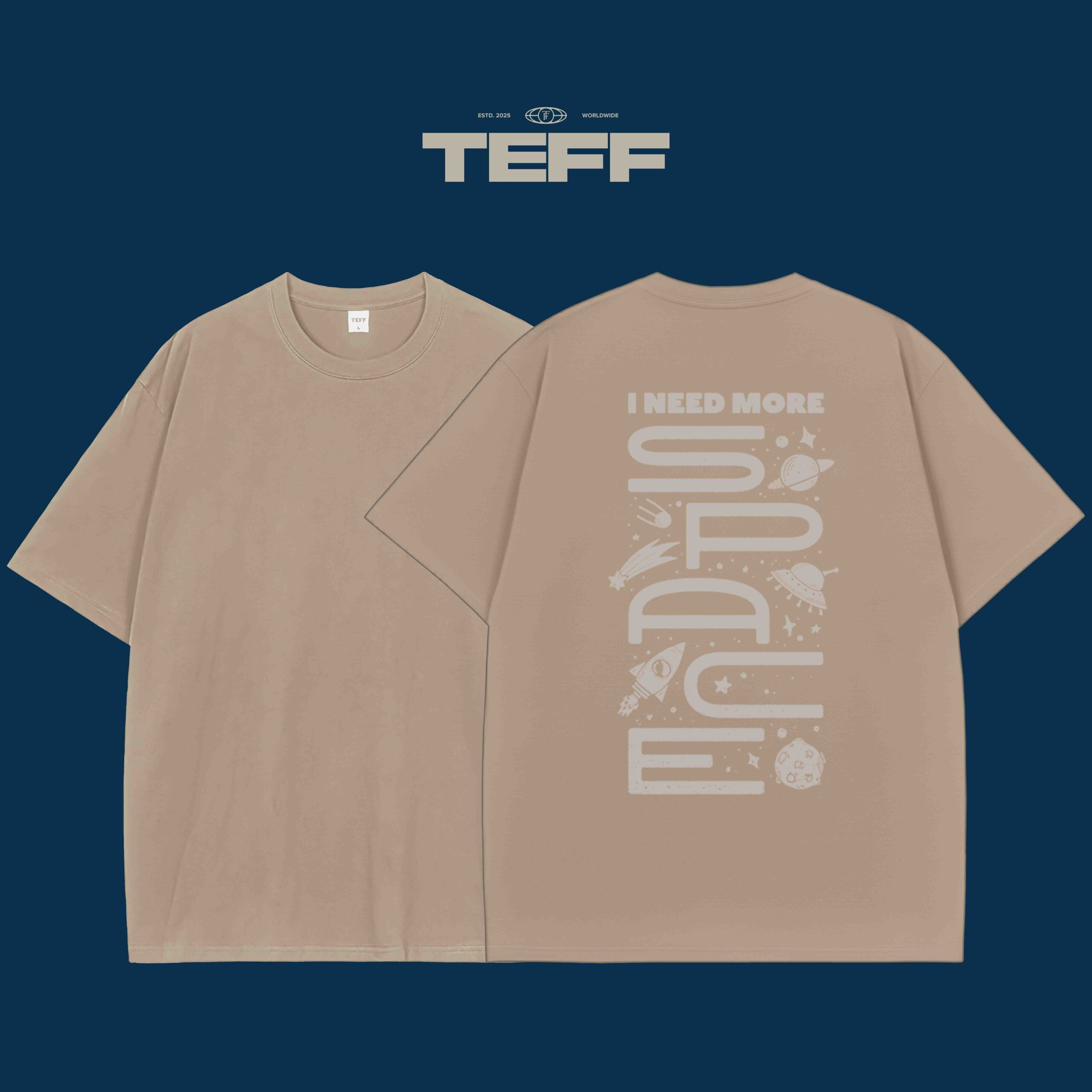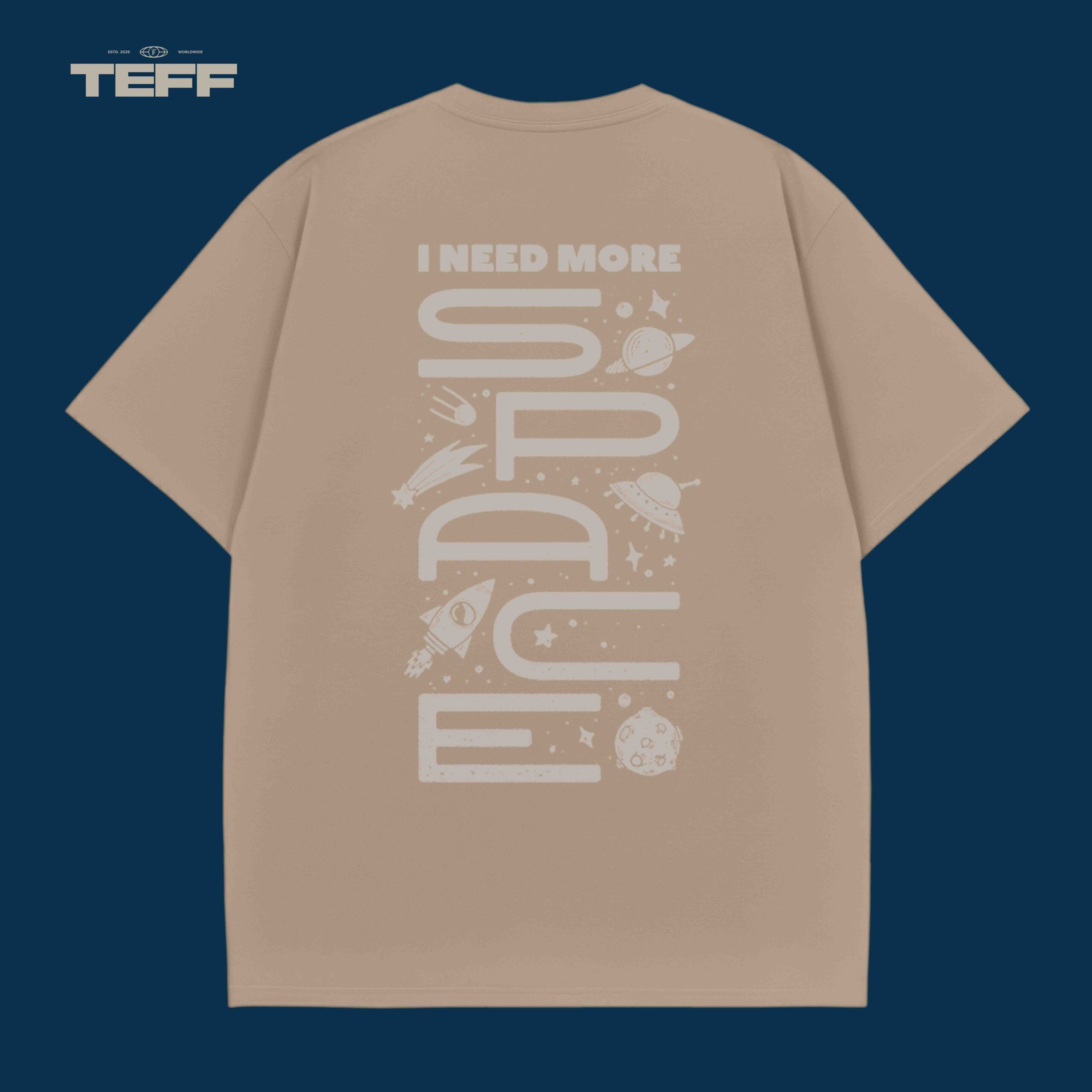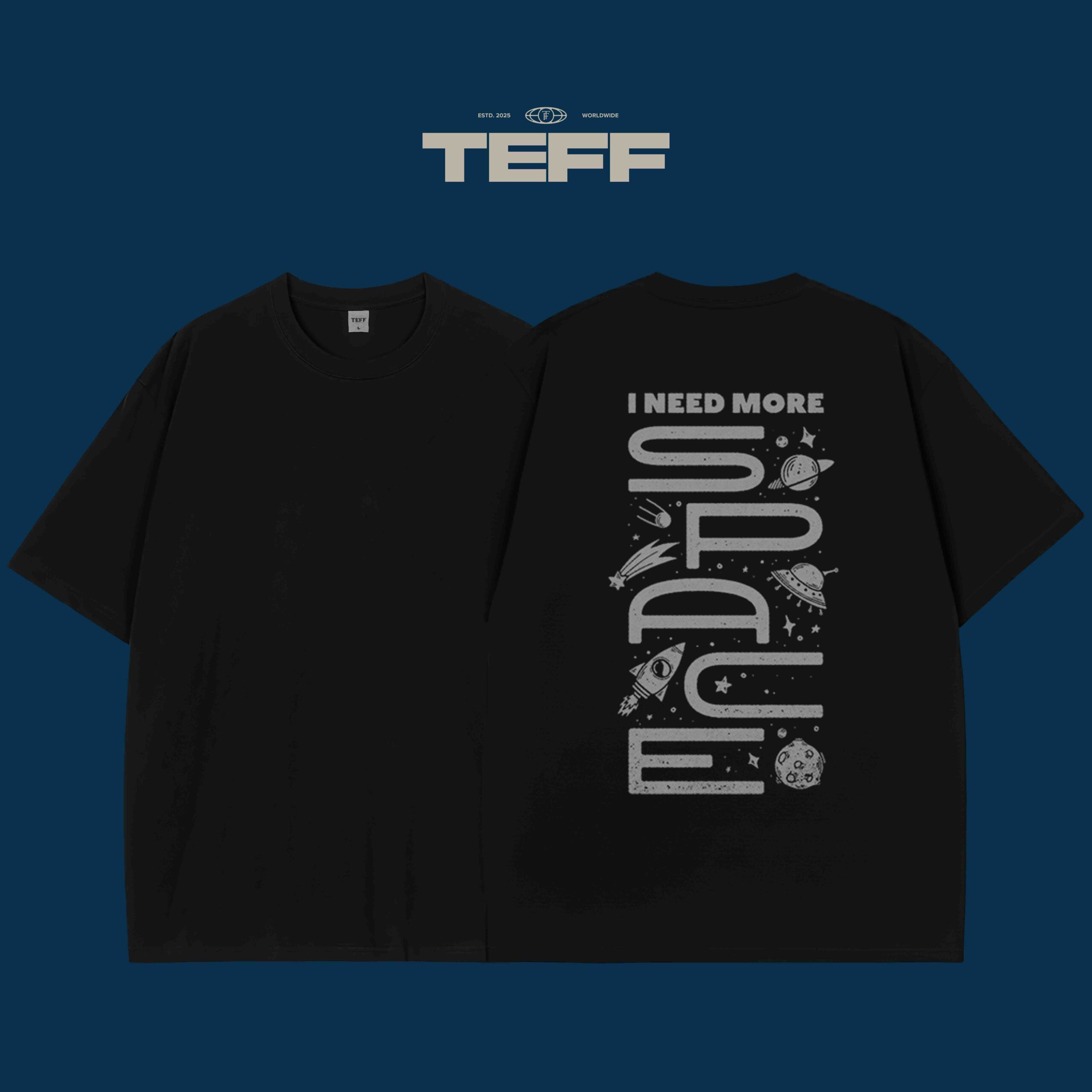 This T-shirt features a vertical graphic design that reads “I NEED MORE SPACE” with cosmic elements, including rockets, planets, and stars. A bold and quirky statement for those who feel like they need room to breathe.