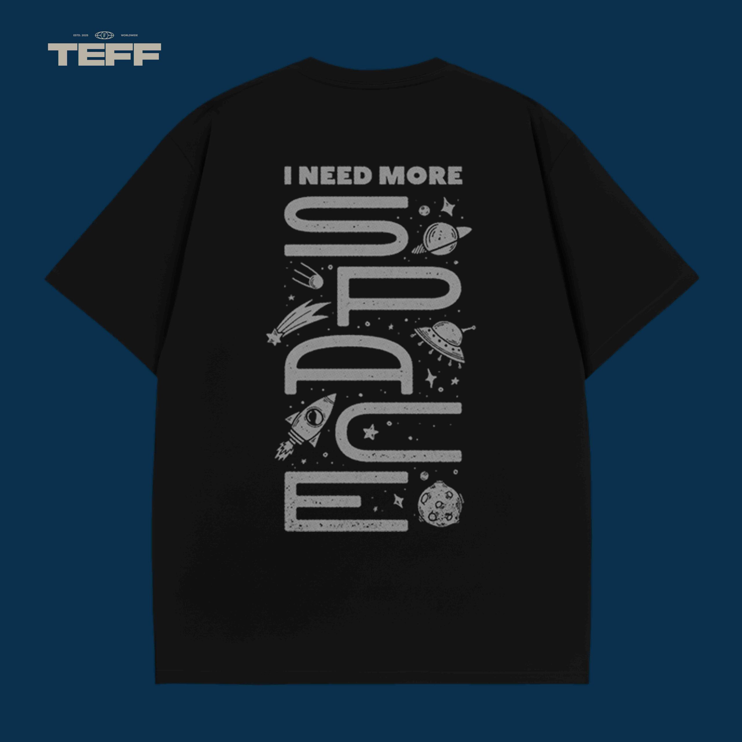 The space-themed graphic design on this T-shirt creates a bold visual statement. The phrase “I NEED MORE SPACE” is placed vertically on the back, surrounded by whimsical cosmic elements like planets, rockets, and stars, creating a dreamy and adventurous vibe. The design is simple yet striking, symbolizing the desire for freedom and personal space.