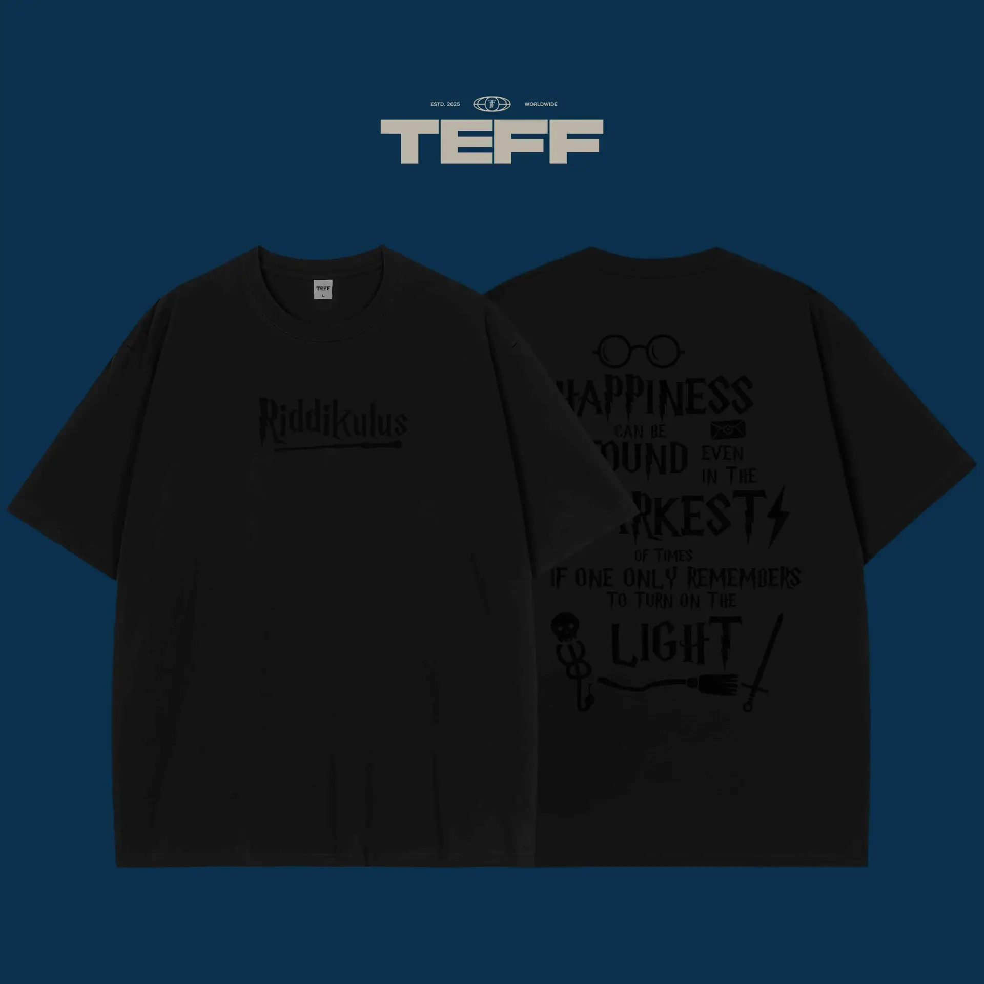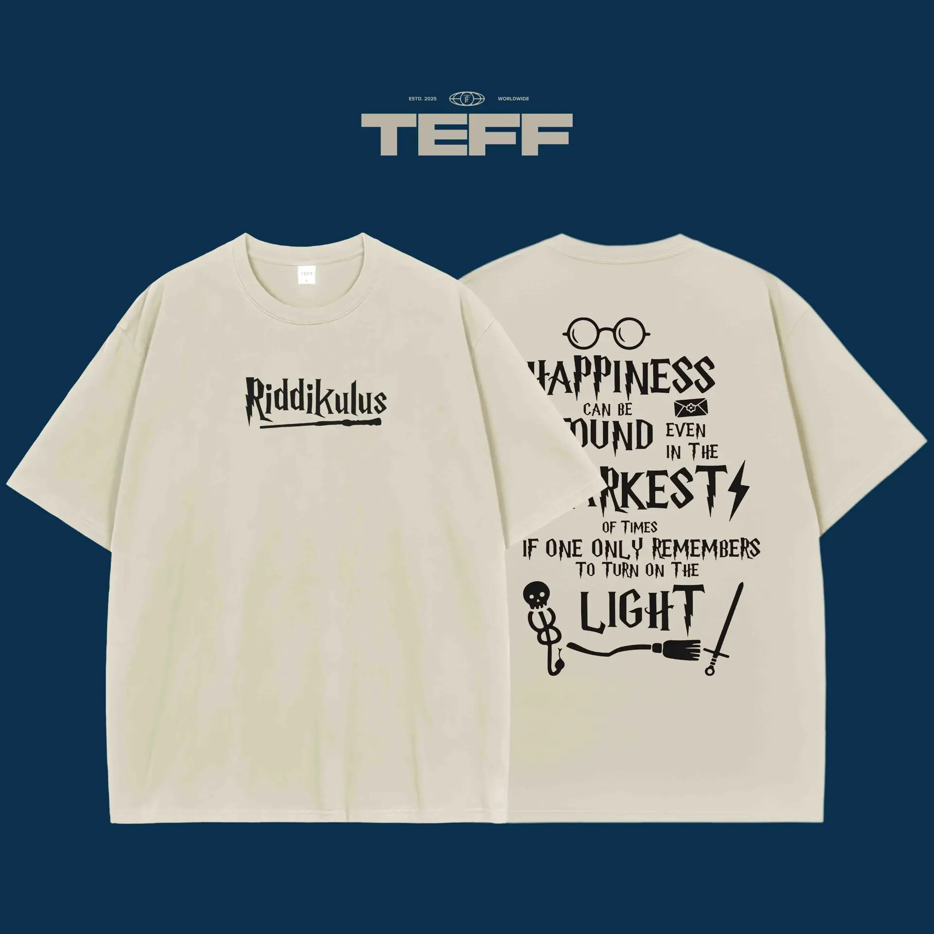 Embrace the magic with this Harry Potter inspired T-shirt. The front showcases the famous Riddikulus spell, designed to defeat boggarts with a twist of humor and courage. The back is adorned with a quote from the wise Dumbledore, reminding you that happiness can be found even in the darkest of times just remember to turn on the light. Whether you’re a Harry Potter fan or someone who loves a mix of fantasy and inspiration, this T-shirt brings magic and positivity together. Perfect for casual outings or as a daily reminder to always seek the light in tough situations. A design that speaks to the Harry Potter universe’s power of resilience and joy. Wear it and let the magic unfold!