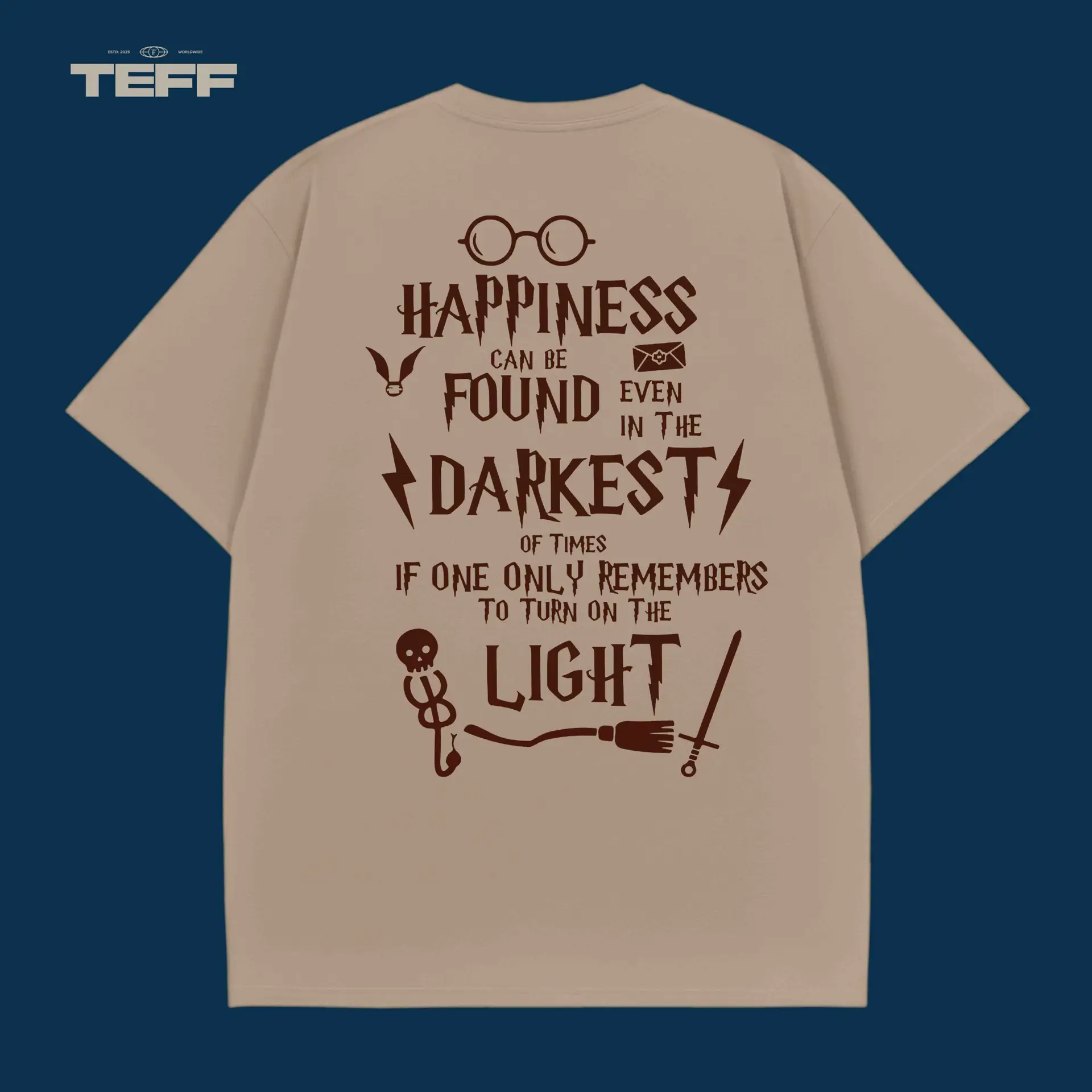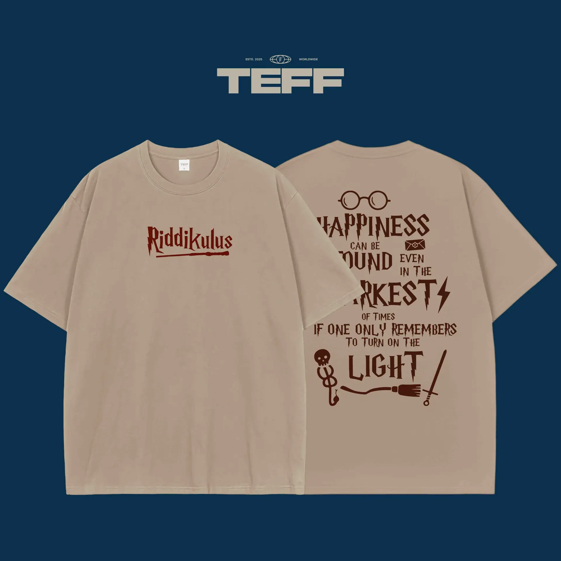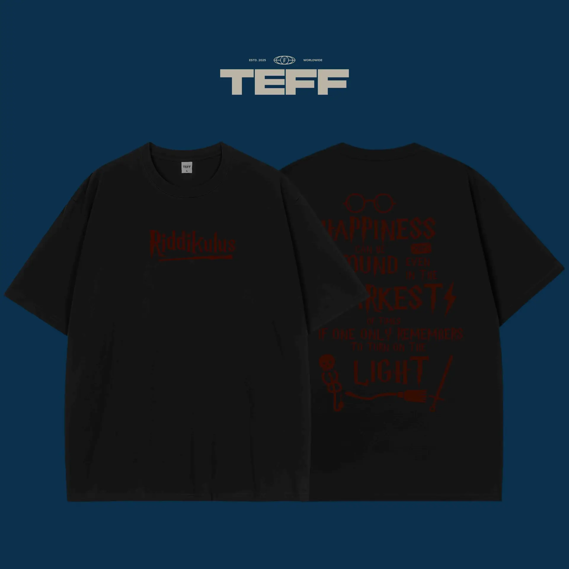 Embrace the magic with this Harry Potter inspired T-shirt. The front showcases the famous Riddikulus spell, designed to defeat boggarts with a twist of humor and courage. The back is adorned with a quote from the wise Dumbledore, reminding you that happiness can be found even in the darkest of times just remember to turn on the light. Whether you’re a Harry Potter fan or someone who loves a mix of fantasy and inspiration, this T-shirt brings magic and positivity together. Perfect for casual outings or as a daily reminder to always seek the light in tough situations. A design that speaks to the Harry Potter universe’s power of resilience and joy. Wear it and let the magic unfold!
