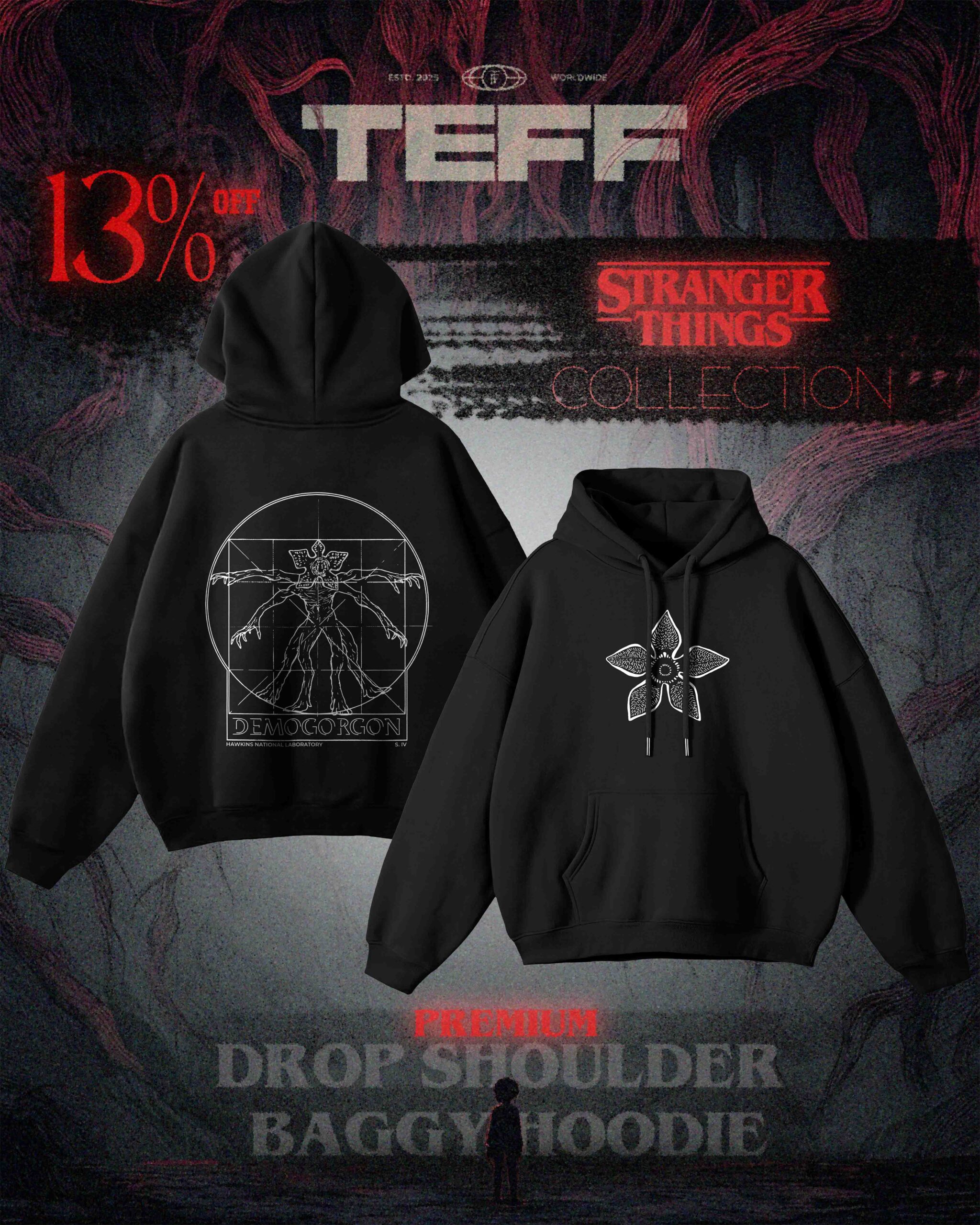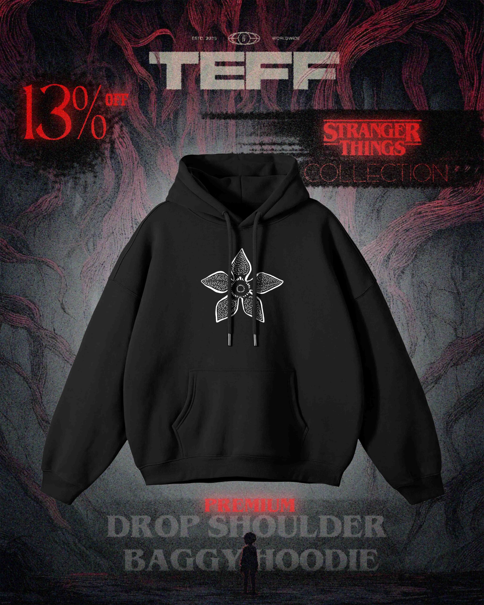Stay cozy in our premium oversize drop-shoulder hoodie, detailed with a sleek Stranger Things–inspired graphic. Soft, stylish, and made for fans who love subtle nostalgia.