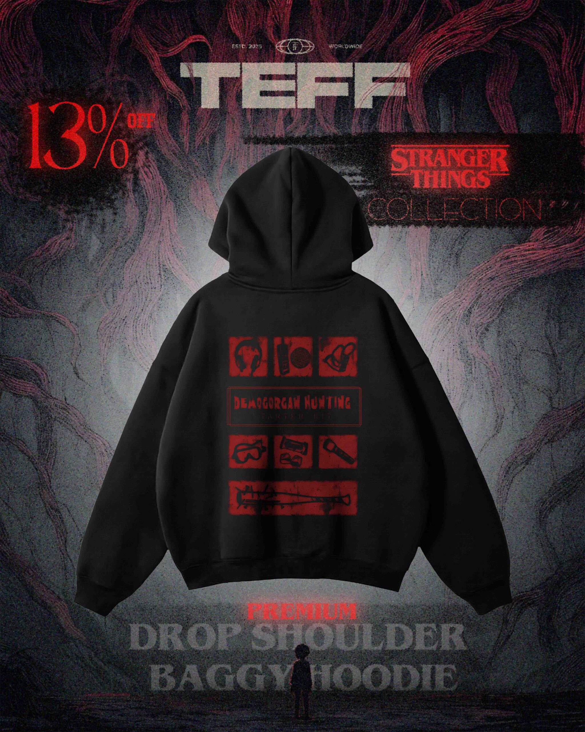 Stay cozy in our premium oversize drop-shoulder hoodie, detailed with a sleek Stranger Things–inspired graphic. Soft, stylish, and made for fans who love subtle nostalgia.