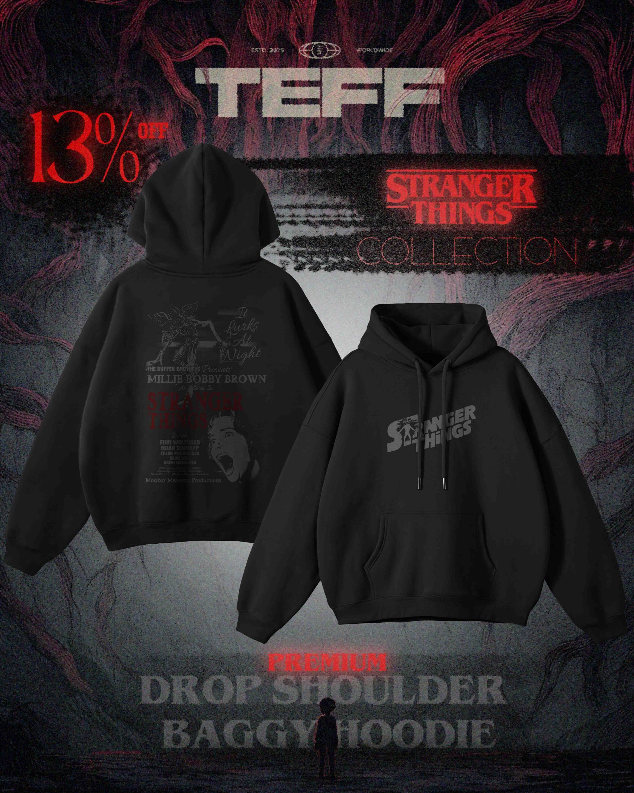 Stay cozy in our premium oversize drop-shoulder hoodie, detailed with a sleek Stranger Things–inspired graphic. Soft, stylish, and made for fans who love subtle nostalgia.